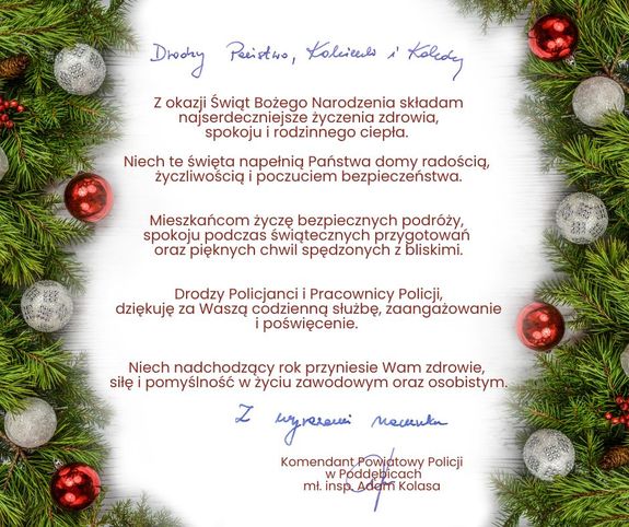 Komendant Powiatowy Policji w Poddębicach mł. insp. Adam Kolasa składa życzenia spokojnych i radosnych Świąt Bożego Narodzenia oraz szczęścia i pomyślności w nadchodzącym 2026 roku.