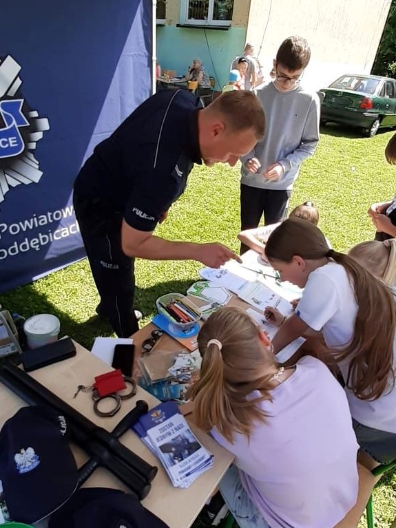 Wśród licznych atrakcji swoje stoisko mieli także funkcjonariusze Policji, którzy chętnie rozmawiali z uczestnikami festynu – zarówno dorosłymi, jak i dziećmi – na każdy temat. Była to świetna okazja do bliższego poznania pracy policjanta, zadania pytań dotyczących bezpieczeństwa w codziennym życiu, a także przygotowania się do zbliżających się wakacji.