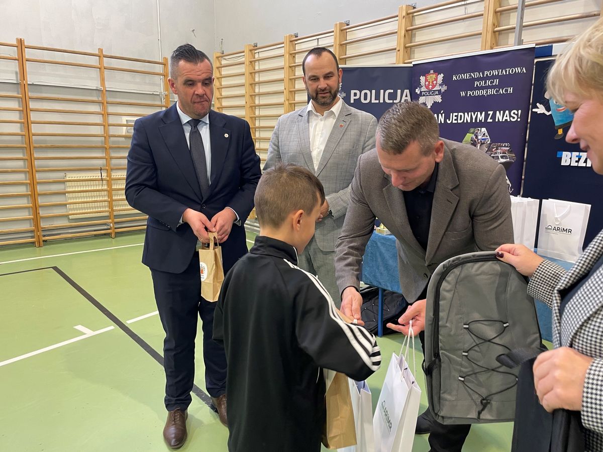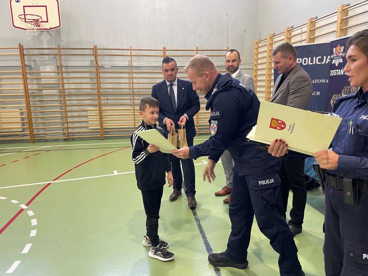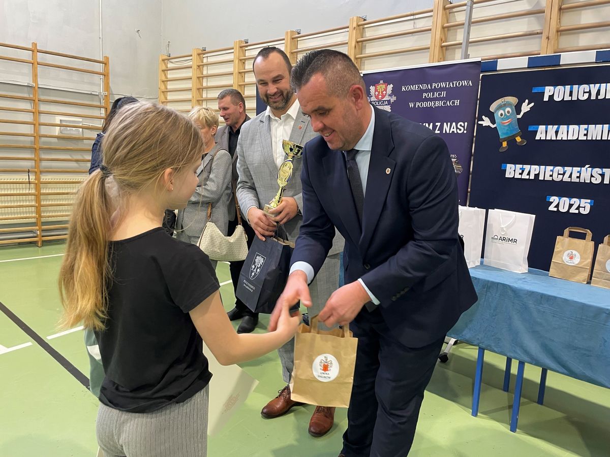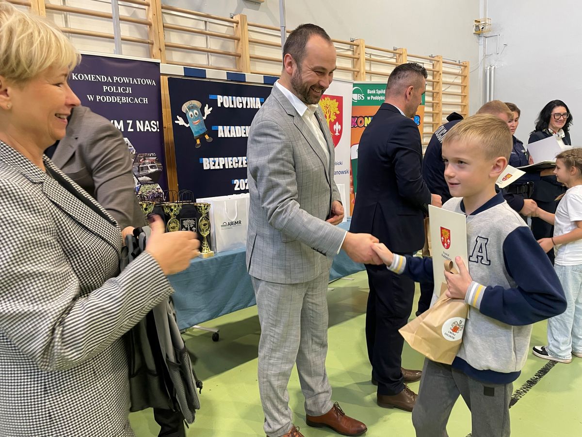 Upominki oraz nagrody dla uczestników wręczali przedstawiciele instytucji wspierających wydarzenie, w tym Komendant Powiatowy Policji w Poddębicach młodszy inspektor Adam Kolasa, Starosta Poddębicki pan Sebastian Romanowski, Wójt Gminy Dalików Pan Radosław Arkusz, Kierownik Biura Powiatowego Oddziału w Bałdrzychowie Agencji Restrukturyzacji i Modernizacji Rolnictwa Pan Leszek Chmielecki oraz Zarząd Banku Spółdzielczego w Poddębicach reprezentowany przez Wiceprezes Zarządu Panią Agnieszkę Kantorczyk. Przedstawiciele tych instytucji przekazali gadżety i upominki dla dzieci oraz podkreślili znaczenie edukacji na rzecz bezpieczeństwa już od najmłodszych lat.