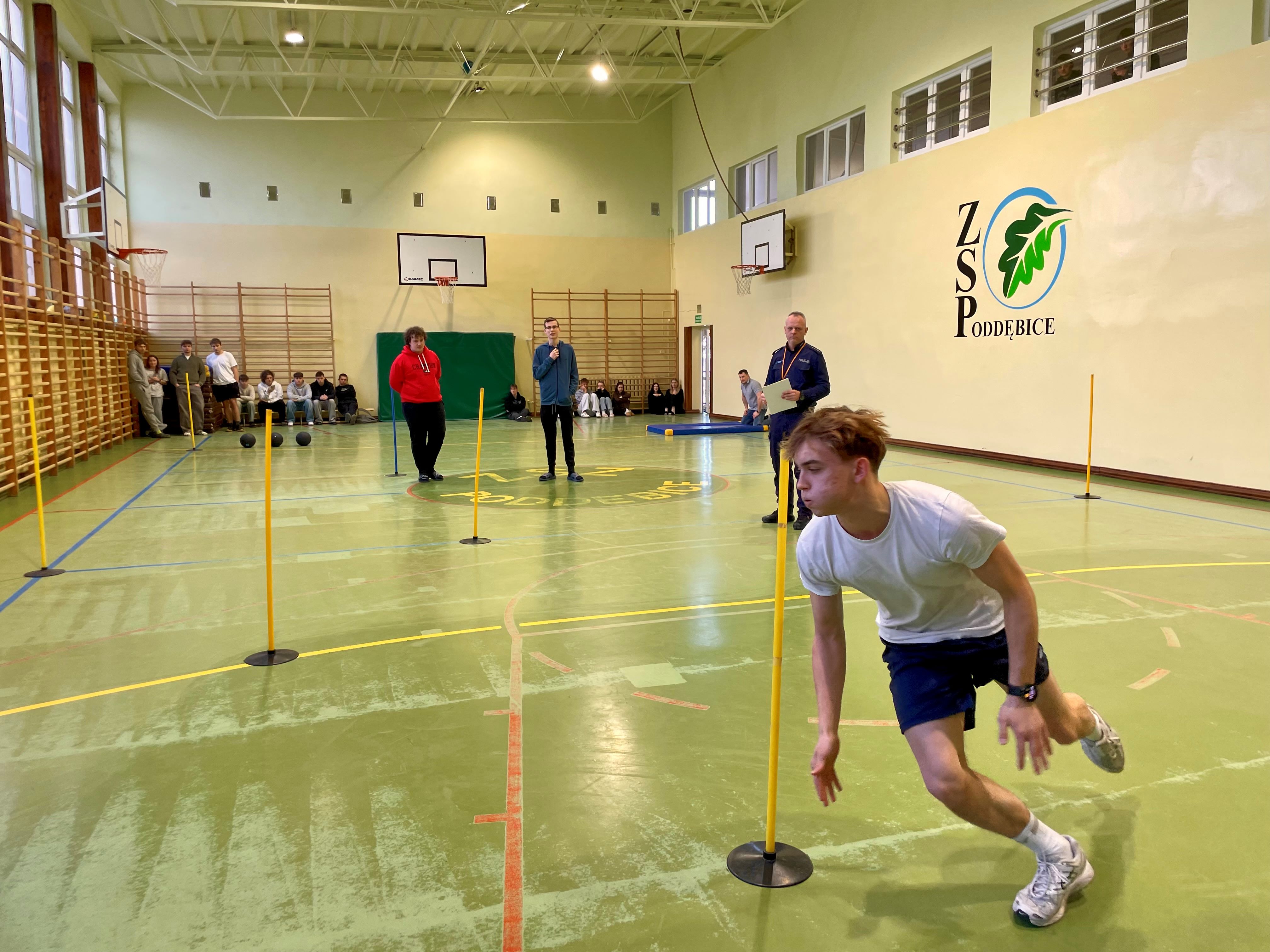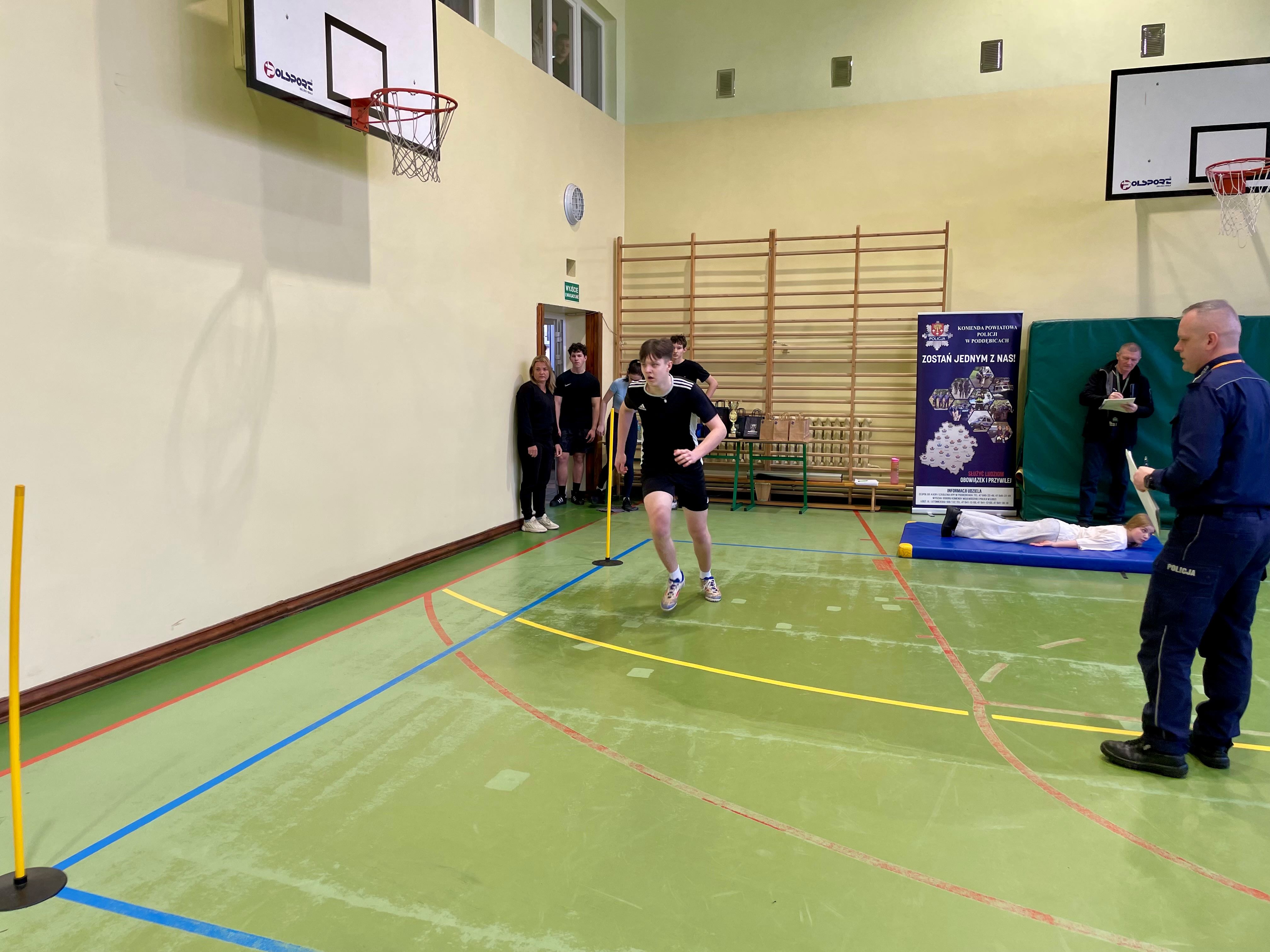 W hali sportowej Zespołu Szkół Ponadpodstawowych w Poddębicach odbyły się powiatowe eliminacje turnieju dla uczniów szkół średnich o Puchar Komendanta Wojewódzkiego Policji w Łodzi. Młodzież rywalizowała w teście wiedzy oraz na torze sprawnościowym wykorzystywanym podczas doboru do służby w Policji.