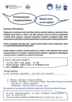 - "Masz wpływ na swoje bezpieczeństwo" - debata społeczna z seniorami z Poddębic Kierownictwo Komendy Powiatowej Policji w Poddębicach zorganizowało debatę społeczną pod hasłem ,,Jak uniknąć zagrożeń – nie daj się oszukać!”. M.in. kluczowym elementem debaty było wskazanie seniorom zagrożeń zdiagnozowanych na podstawie Krajowej Mapie Zagrożeń Bezpieczeństwa. Do dyskusji o bezpieczeństwie osób starszych zaproszeni zostali m.in. przedstawiciele Biblioteki Publicznej oraz mieszkańcy Poddębic.