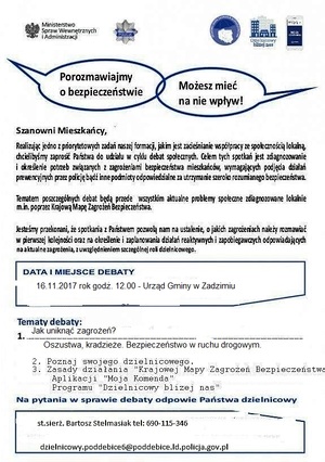 - „Masz wpływ na swoje bezpieczeństwo” – Debata w Zadzimiu Kierownictwo Komendy Powiatowej Policji w Poddębicach zorganizowało debatę społeczną pod hasłem ,,Jak uniknąć zagrożeń?”. Kluczowym elementem debaty było wskazanie uczestnikom zagrożeń zdiagnozowanych na podstawie Krajowej Mapy Zagrożeń Bezpieczeństwa. Do dyskusji o bezpieczeństwie zaproszeni zostali m.in. przedstawiciele samorządu lokalnego, sołtysi oraz mieszkańcy gminy.