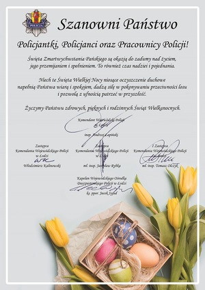 - Życzenia wielkanocne Kierownictwo łódzkiego garnizonu policji z insp. Andrzejem Łapińskim na czele przekazało życzenia świąteczne funkcjonariuszom i pracownikom policji oraz ich rodzinom.